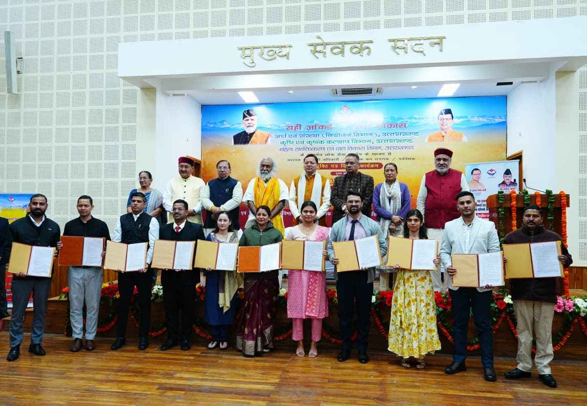 मुख्यमंत्री पुष्कर सिंह धामी ने गुरूवार को मुख्यमंत्री कैम्प कार्यालय स्थित मुख्य सेवक सदन में आयोजित कार्यक्रम में लोक सेवा आयोग के माध्यम से चयनित अर्थ एवं संख्या, कृषि एवं उद्यान तथा महिला सशक्तिकरण एवं बाल विकास विभाग के 178 अभ्यर्थियों को नियुक्ति पत्र प्रदान किए। जिसमें अर्थ एवं संख्या विभाग के 117, कृषि विभाग के 12 उद्यान विभाग के 30 तथा महिला सशक्तिकरण एवं बाल विकास विभाग के 19 अभ्यर्थी शामिल है। उन्होंने नवनियुक्त अभ्यर्थियों को बधाई देते हुए विश्वास व्यक्त किया कि सभी ईमानदारी, निष्ठा एवं समर्पण के साथ दायित्वों का निर्वहन कर उत्तराखंड को विकसित, आत्मनिर्भर एवं देश के अग्रणी राज्यों में शामिल करने के संकल्प को साकार करने में महत्वपूर्ण भूमिका निभाएँगे।