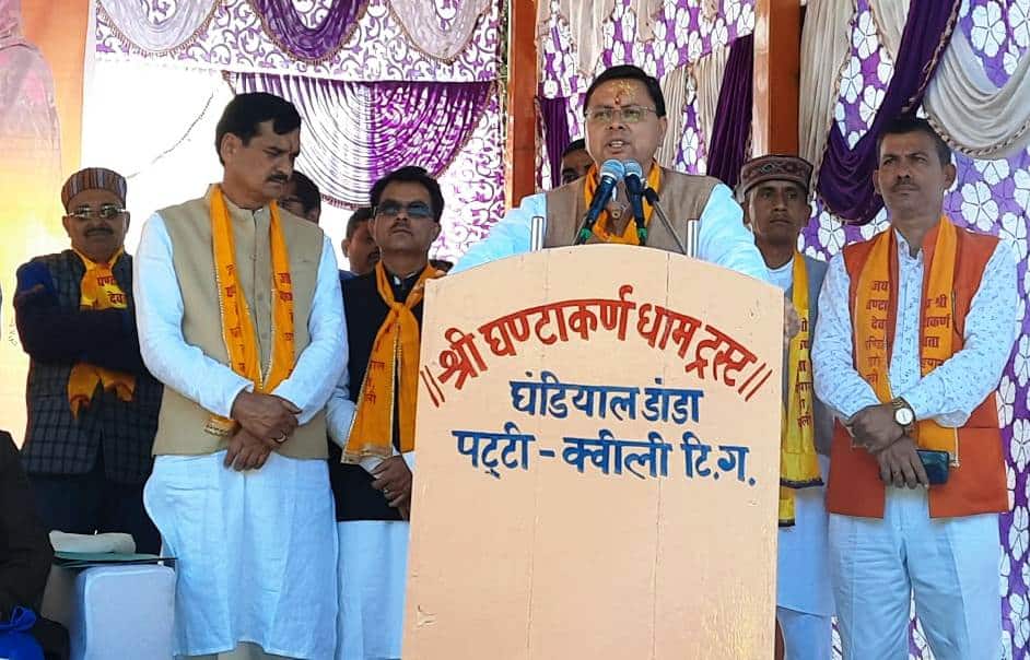 मुख्यमंत्री ने कहा कि प्रदेश सरकार प्रधानमंत्री के विजन को साकार करने का कार्य कर रही है। उत्तराखण्ड को देश का अग्रणी राज्य बनाना है इसके लिए राज्य सरकार निरंतर प्रयासरत है। उन्होंने कहा कि देहरादून से टिहरी के बीच 8 हजार करोड़ की लागत से बनने वाली सुरंग के निर्माण की केन्द्र सरकार से सैद्धांतिक स्वीकृति मिल चुकी है। इस अवसर पर मुख्यमंत्री ने जनपद व प्रदेश की सुख और समृद्धि के लिए घण्डियाल देवता से प्रार्थना की। इस अवसर पर माता मंगला ने घंटाकर्ण धाम में धर्मशाला हेतु हंस फाउण्डेशन के माध्यम से 25 लाख रुपए की सहायता प्रदान करने की बात कही। इस अवसर पर कृषि मंत्री सुबोध उनियाल, विधायक देवप्रयाग विनोद कंडारी, जिला पंचायत अध्यक्षा सोना सजवाण, राज्य बीस सूत्री कार्यक्रम के उपाध्यक्ष दिनेश डोभाल, पूर्व विधायक ओम गोपाल रावत, प्रमुख विकासखण्ड चम्बा शिवानी बिष्ट, प्रमुख नरेंद्रनगर राजेन्द्र भंडारी, घंटाकर्ण धाम ट्रस्ट के अध्यक्ष विजय प्रकाश बिजल्वाण आदि उपस्थित थे।
