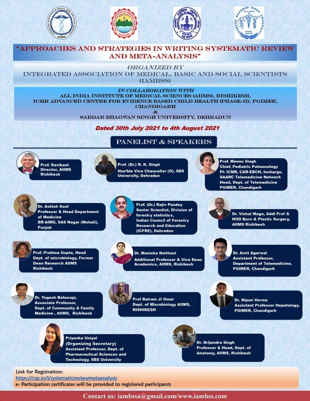 ऋषिकेश इंटीग्रेटेड एसोसिएशन ऑफ मेडिकल, सोशल एंड बेसिक साइंटिस्ट्स (आईएएमबीएसएस) के तत्वावधान में शुक्रवार से 4 अगस्त तक चलने वाली 6 दिवसीय ऑनलाइन कार्यशाला का आयोजन किया जाएगा। अखिल भारतीय आयुर्विज्ञान संस्थान (एम्स) ऋषिकेश, आई.सी.एम.आर पीजीआईएमईआर, चंडीगढ़ एवं सरदार भगवान सिंह विश्वविद्यालय की ओर से