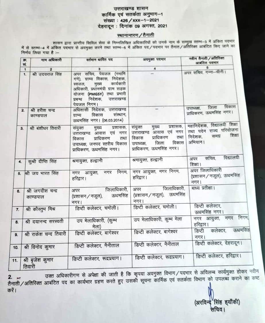 धामी सरकार में शासन स्तर पर अधिकारीयों के लगातार तबादले जा रहे हैं पुर्व में आईएएस के तबादलों के बाद आज उत्तराखंड में शासन ने पीसीएस अधिकारियों के तबादले कर दिए हैं । उदयराज को अपर सचिव गन्ना , हरीश चंद्र कांडपाल को उपाध्यक्ष जिला विकास प्राधिकरण उधम सिंह नगर बनाया गया । तो वहीँ बंशीधर तिवारी को महानिदेशक विद्यालय शिक्षा की जिम्मेदारी सौंपी गई है । जबकि दीप्ति सिंह को अपर सचिव विद्यालय शिक्षा बनाया गया है । जय भारत सिंह को अपर जिलाधिकारी प्रशासन उधम सिंह नगर बनाया गया । जगदीश चंद्र कांडपाल को बाध्य प्रतीक्षा रखा गया । कौस्तुभ मिश्र को डिप्टी कलेक्टर उधम सिंह नगर बनाया गया । दयानंद सरस्वती को नगर आयुक्त नगर निगम हरिद्वार बनाया गया । राकेश चंद्र तिवारी को डिप्टी कलेक्टर उधम सिंह नगर बनाया गया। विनोद कुमार को डिप्टी कलेक्टर देहरादून कि जिम्मेदारी दी गई है । बृजेश कुमार तिवारी को डिप्टी कलेक्टर हरिद्वार बनाया गया।