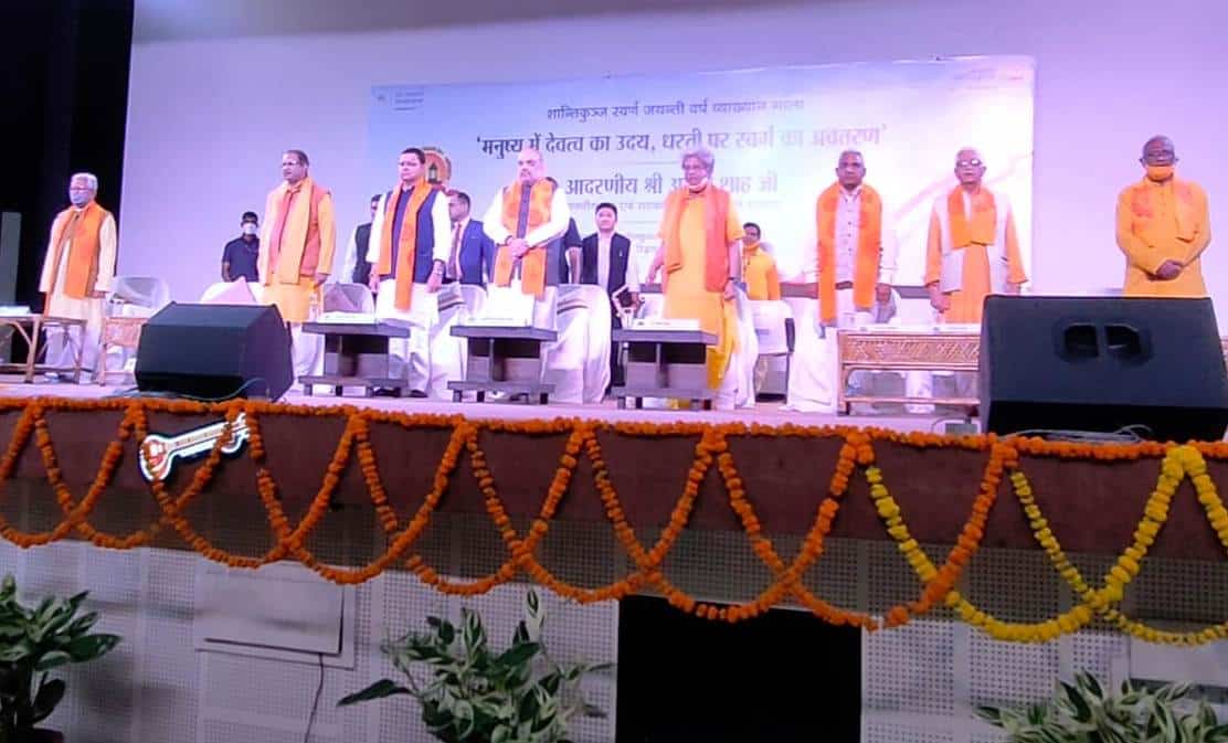 केन्द्रीय गृह मंत्री ने समारोह को सम्बोधित करते हुये कहा कि गायत्री परिवार ने सनातन धर्म का पूरे विश्व में प्रचार-प्रसार किया। उन्होंने कहा कि गायत्री परिवार अपना स्वर्ण जयन्ती महोत्सव मना रहा है तथा देश आजादी का अमृत महोत्सव मना रहा है। उन्होंने कहा कि अच्छे कार्य होते हैं तो देश की संस्कृति को ऊर्जा मिलती है। हम ऐसी गतिविधियों का हमेशा समर्थन करते हैं। उन्होंने कहा कि करोड़ों गायत्री मंत्रों के उच्चारण से यहां दिव्य वातावरण बना है। इससे आनन्द व उत्साह दोनों बढ़ते हैं। गृह मंत्री ने आचार्य श्रीराम शर्मा का उल्लेख करते हुए कहा कि उन्होंने अपना पूरा जीवन का कालखण्ड गायत्री मंत्र को घर-घर तक पहुंचाने में लगा दिया। इसमें उनका बहुत बड़ा योगदान है। उन्होंने गायत्री मंत्र के 24 अक्षरों का उल्लेख करते हुए कहा कि गायत्री मंत्र के 24 अक्षर, 24 सद्ग्रन्थियों को जाग्रत करते हैं, जो हमें देवत्व की ओर ले जाते हैं। उन्होंने गायत्री मंत्र के महत्व का उल्लेख करते हुए कहा कि दिव्य गायत्री मंत्र का शुद्ध उच्चारण करने से यह आपको देवत्व की ओर ले जा सकता है। उन्होंने बताया कि मैं चार साल की आयु से गायत्री मंत्र का जाप कर रहा हूं। आजादी का अमृत महोत्सव का जिक्र करते हुए गृह मंत्री ने कहा कि देश की आजादी के लिए हमारे पूर्वजों ने काफी बलिदान दिये। उन्होंने कहा कि आजादी का अमृत महोत्सव संकल्प लेने का वर्ष है। उन्होंने कहा कि हम छोटे-छोटे संकल्प लेकर जैसे पानी बचाना, अन्न की बर्बादी रोकना आदि का संकल्प लेकर भारत को विश्वगुरू के पद पर स्थापित कर सकते हैं। इस अवसर पर मुख्यमंत्री पुष्कर सिंह धामी, राज्यसभा सांसद व भाजपा के राष्ट्रीय मीडिया प्रभारी अनिल बलूनी, योगगुरु स्वामी रामदेव, गीता ज्ञान संस्थानम्, कुरुक्षेत्र के प्रमुख गीता मनीषी स्वामी ज्ञानानन्द, हिन्दू धर्म आचार्य सभा के संयोजक स्वामी परमात्मानन्द सरस्वती, पूज्य स्वामी निर्मलानंदनाथ जी महाराज, चुन चुन गिरि मठ (कर्नाटक), आचार्य श्री कृष्णमणि, प्रमुख : कृष्ण प्रणामी संप्रदाय (गुजरात- राजस्थान), महामंडलेश्वर श्री स्वामी विश्वेश्वरानंद सरस्वती, मुंबई( सुरत गिरि बँगला, हरिद्वार), सहित अनेक गणमान्य विभूतियों की भी इस में उपस्थिति रही।